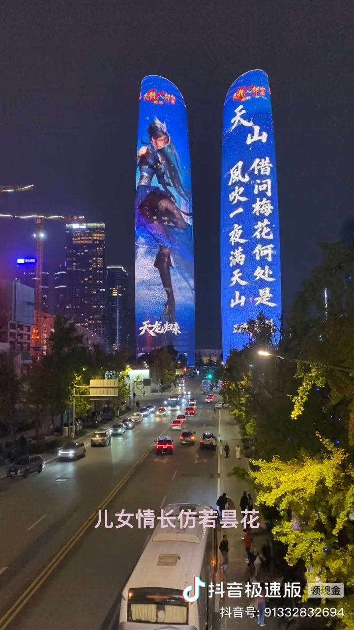 四川成都双子塔灯光秀,投影天龙八部端游宣传片。