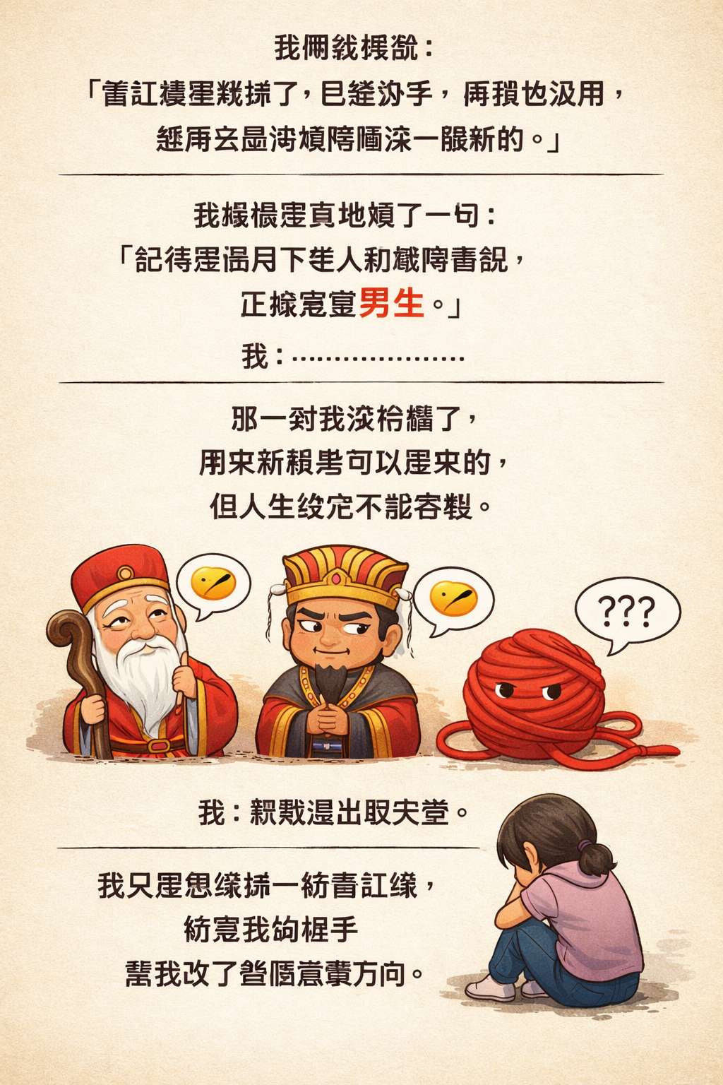 我跟我媽說: 「舊紅線要燒掉了,已經分手,再留也沒用,想再去霞海城隍廟求一條新的。」 我媽很認真地補了一句: 「記得要跟月下老人和城隍爺說,正緣要是男生。」 我: 「………………」 那一刻我突然懂了, 原來紅線是可以重來的, 但人生設定不能客製, 伴侶也無法客製化。 📿 月下老人:🤨 🏮 城隍爺:🤨 🧵 紅線:??? 🧎♀️ 我:默默退出聊天室。 我只是想燒掉一條舊紅線, 結果我媽順手, 幫我改了整個戀愛方向。