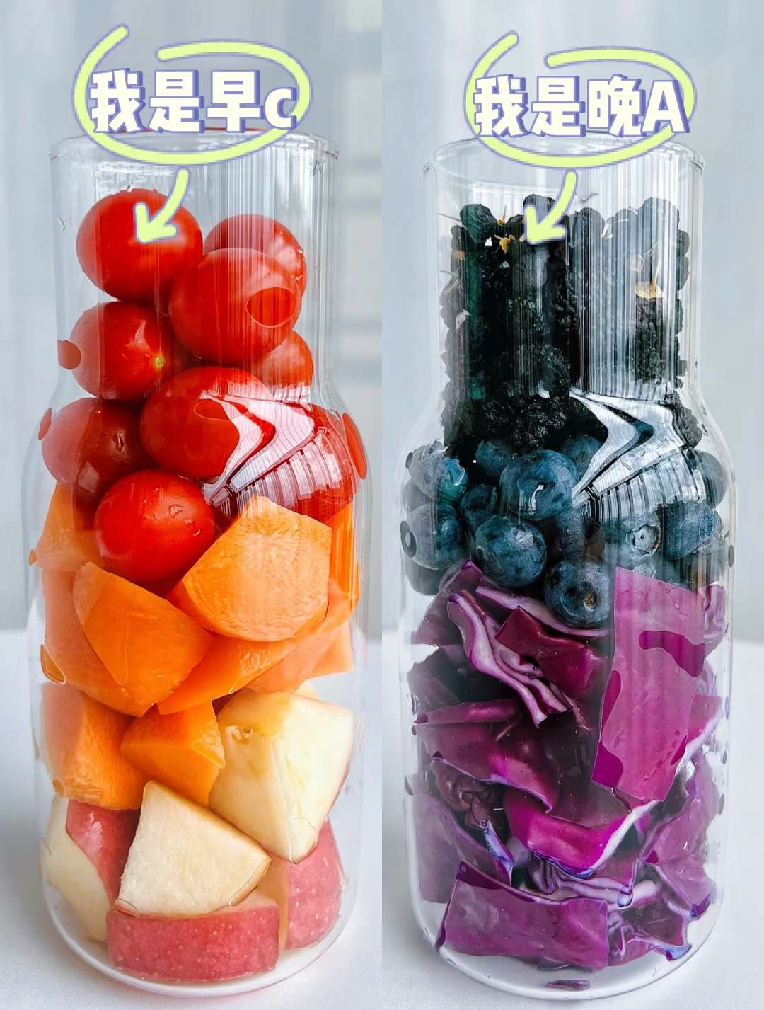 25➕女生坚持早C晚A!!真滴又白又亮!!! 早C晚A!懂滴都懂!!! 胡萝卜➕西红柿➕苹果,满满VC还含番茄红素! 早上喝!美白防晒!! 紫甘蓝➕蓝莓➕桑葚➕黑枸杞,满满花青素! 晚上喝!抗氧防衰! 🌈做法超简单,食材放入破壁机,加适量清水,果汁模式2min就可以喝了! 我一直都很注重防晒抗氧!坚持下来~很显年轻!!