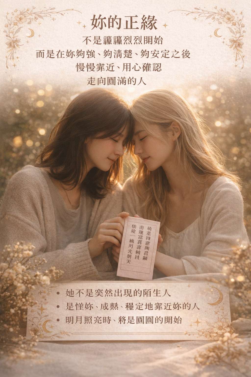 <命定>顛覆傳統,革命腥風血雨,寧可死,也要換來和平。 不是每一段正緣, 都要來得轟轟烈烈。 有些人, 是在妳夠清楚、夠穩定、夠做自己之後, 才慢慢走到妳身邊。 她不是突然出現的陌生人, 而是一步一步確認、 在光裡選擇妳的人。 明月照時, 不是試探, 是確定。 圓滿, 從來都不急。 ✨十五團圓,光滿天✨ 她不是快來的愛, 是來得對的那一個。 🌙