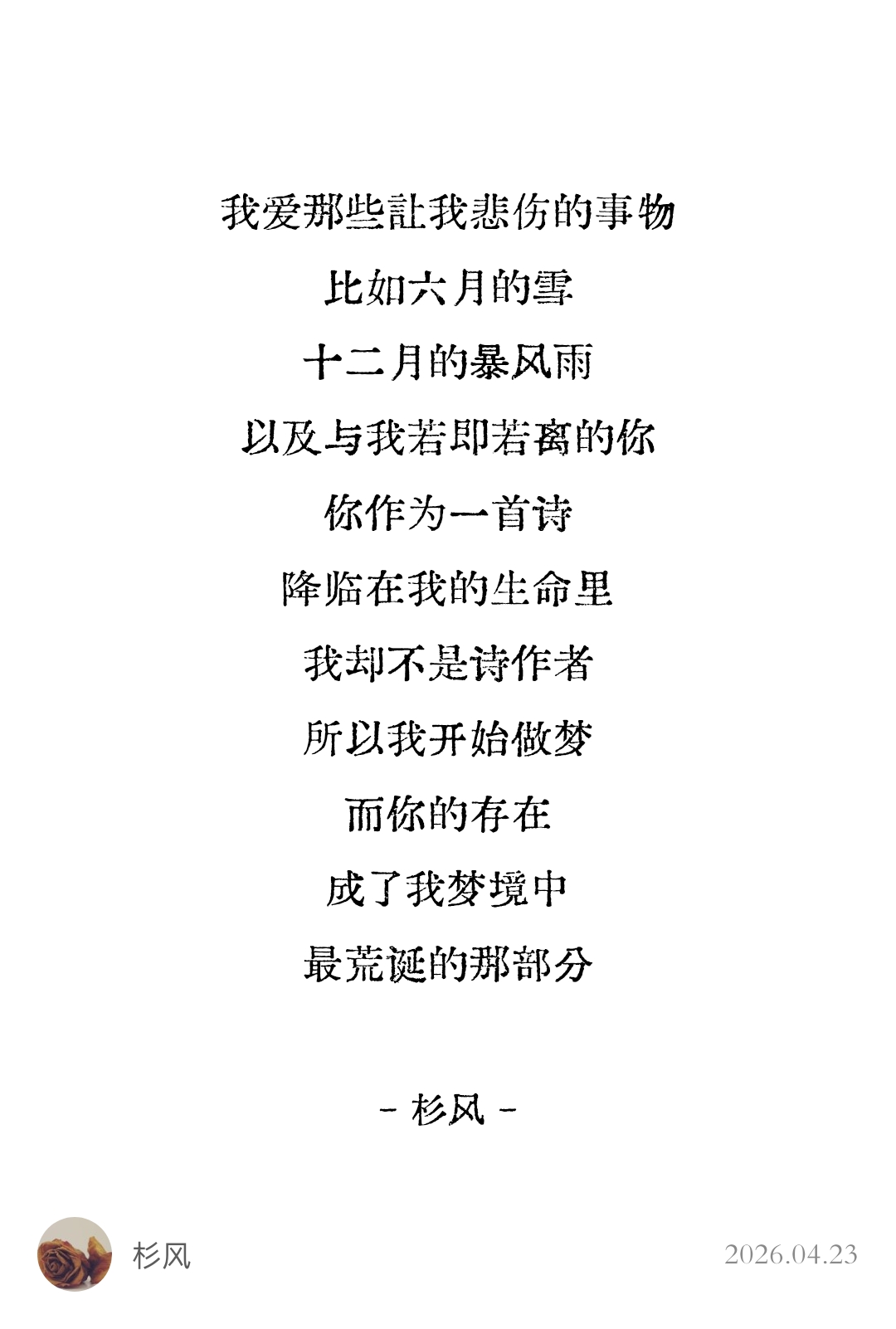 《我爱那些让我悲伤的事物》 我爱那些让我悲伤的事物 比如六月的雪 十二月的暴风雨 以及与我若即若离的你 你作为一首诗 降临在我的生命里 我却不是诗作者 所以我开始做梦 而你的存在 成了我梦境中 最荒诞的那部分