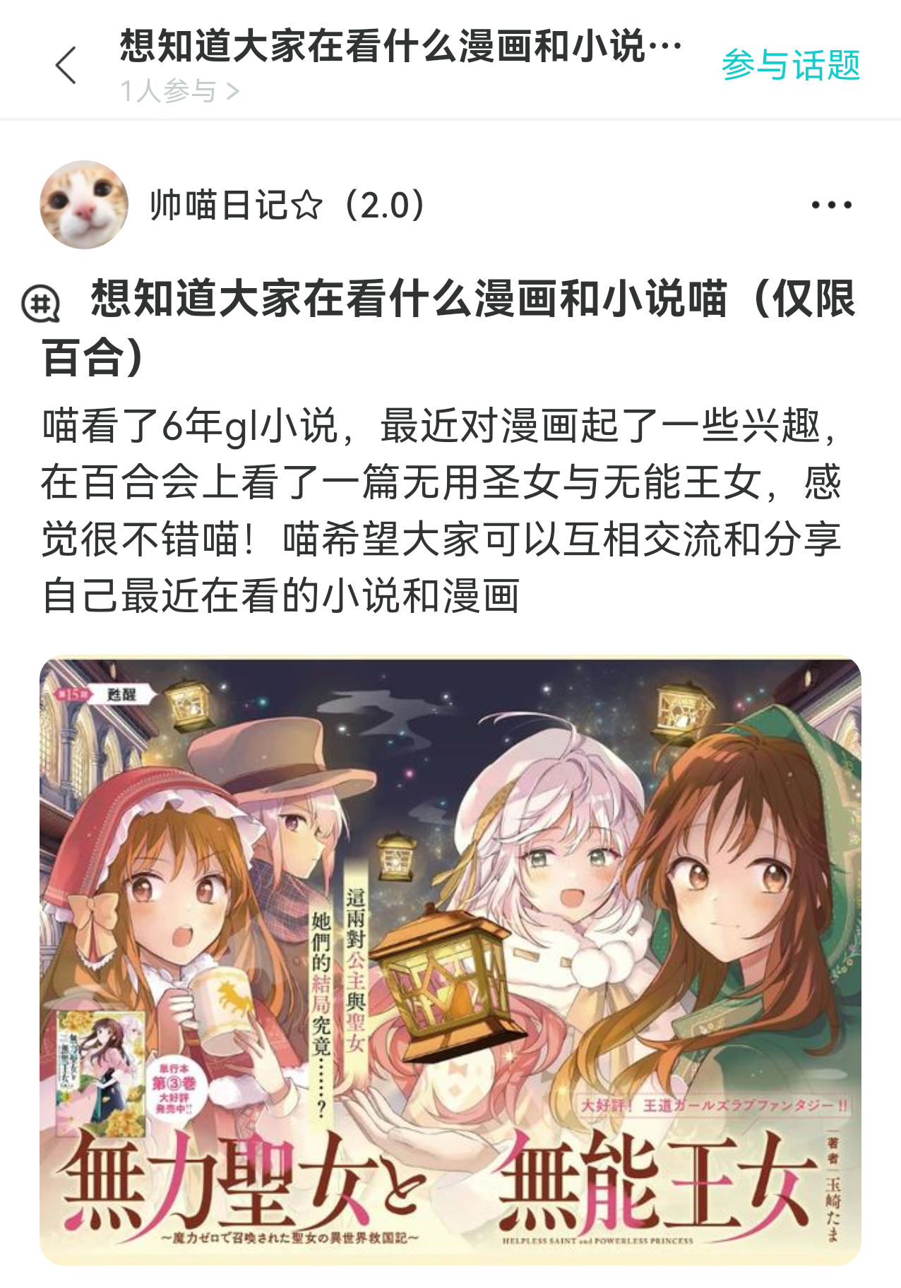 大家一起来分享百合小说和漫画吧喵~ 但是不要推荐一些有任何强j以及wx剧情的沾男虐女gl小说或漫画喵!(亲法也不要推了) 另外自己写的小说也可以哦喵