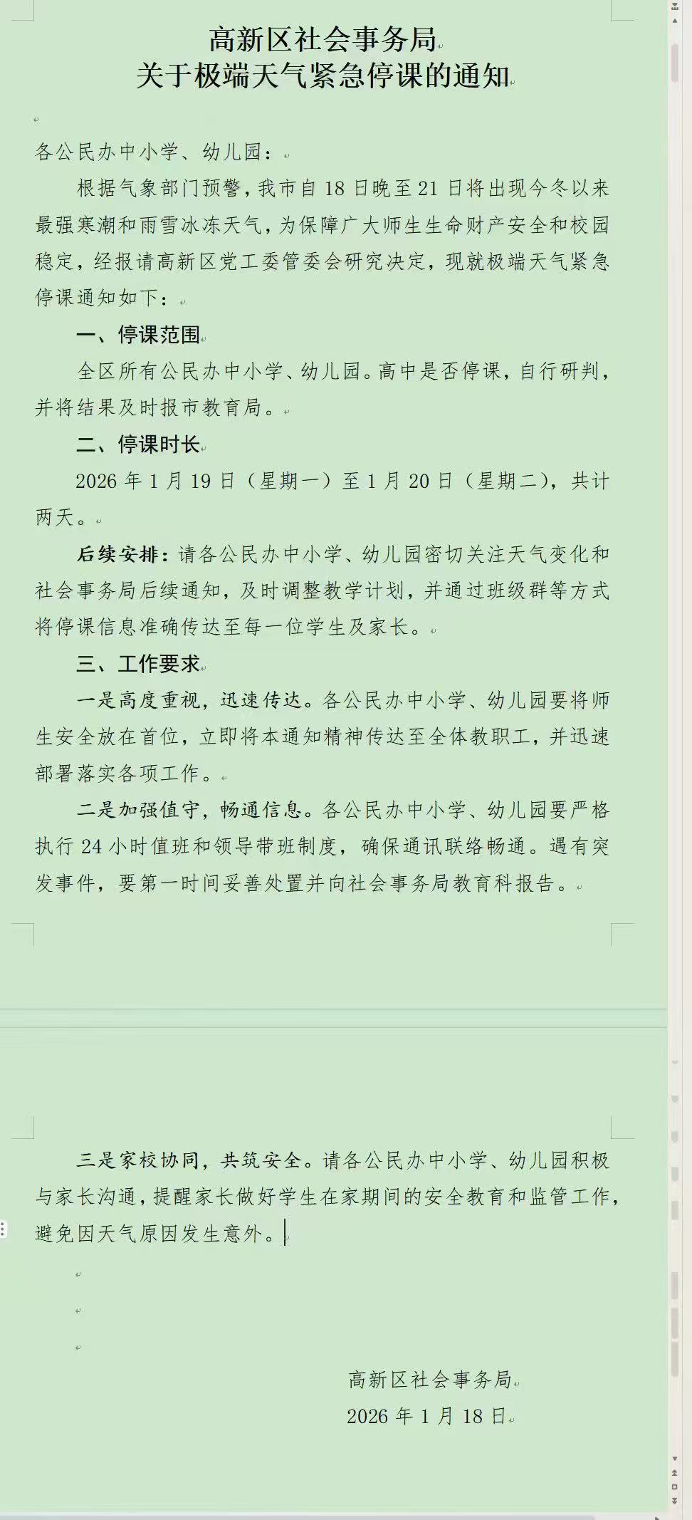 ⚠️ 紧急通知!📢 接高新区教育局通知: ❄️ 今冬最强寒潮+雨雪冰冻来袭 ⏰ 停课时间:1月19日(周一)至20日(周二) 📝 刚把"收心计划"列好 😂 就被"停课通知"打乱节奏 🛋️ 老母亲已备齐: • 零食库存 🍪 • 绘本玩具 📚 • 动画片单 🎬 开启48小时"贴身陪伴"模式 🙏 愿家中"母慈子孝" 🚫 莫变"鸡飞狗跳" 💡 温馨提示: • 减少外出 🚶♂️ • 保暖防滑 🧤