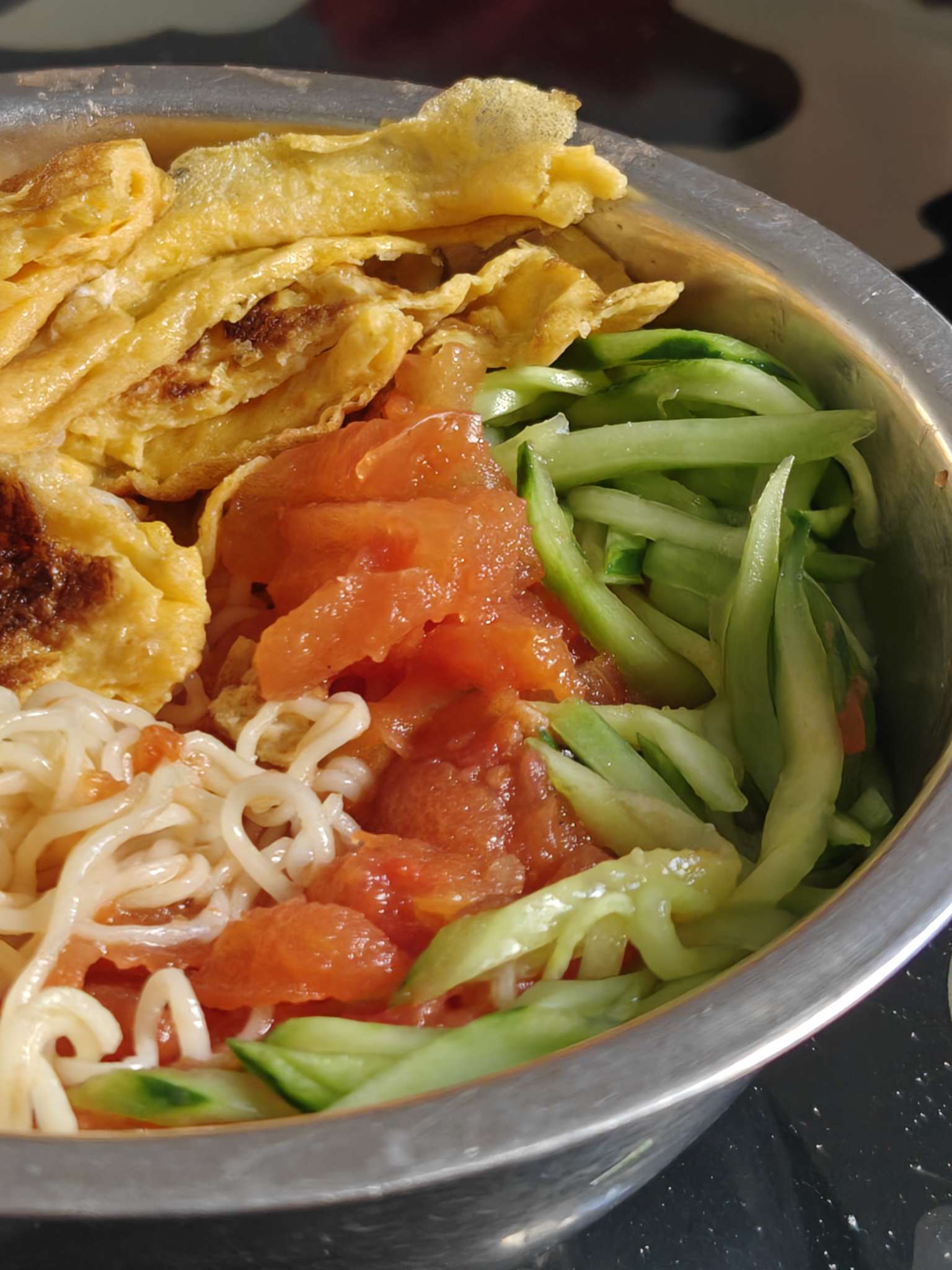 轰炸厨房 又到了啊万轰炸厨房时间。今天破天荒去超市买食材,打算做个番茄鸡蛋丝面。番茄酱忘记买了,好在三个番茄也能cover到。想把煎好的鸡蛋切丝,怕烫索性用铲子变成了鸡蛋块。想起来之前吃的脆脆青瓜丝,刀功堪忧变成了青瓜丝(粗壮版)。好在熟了,能吃,我真棒。
