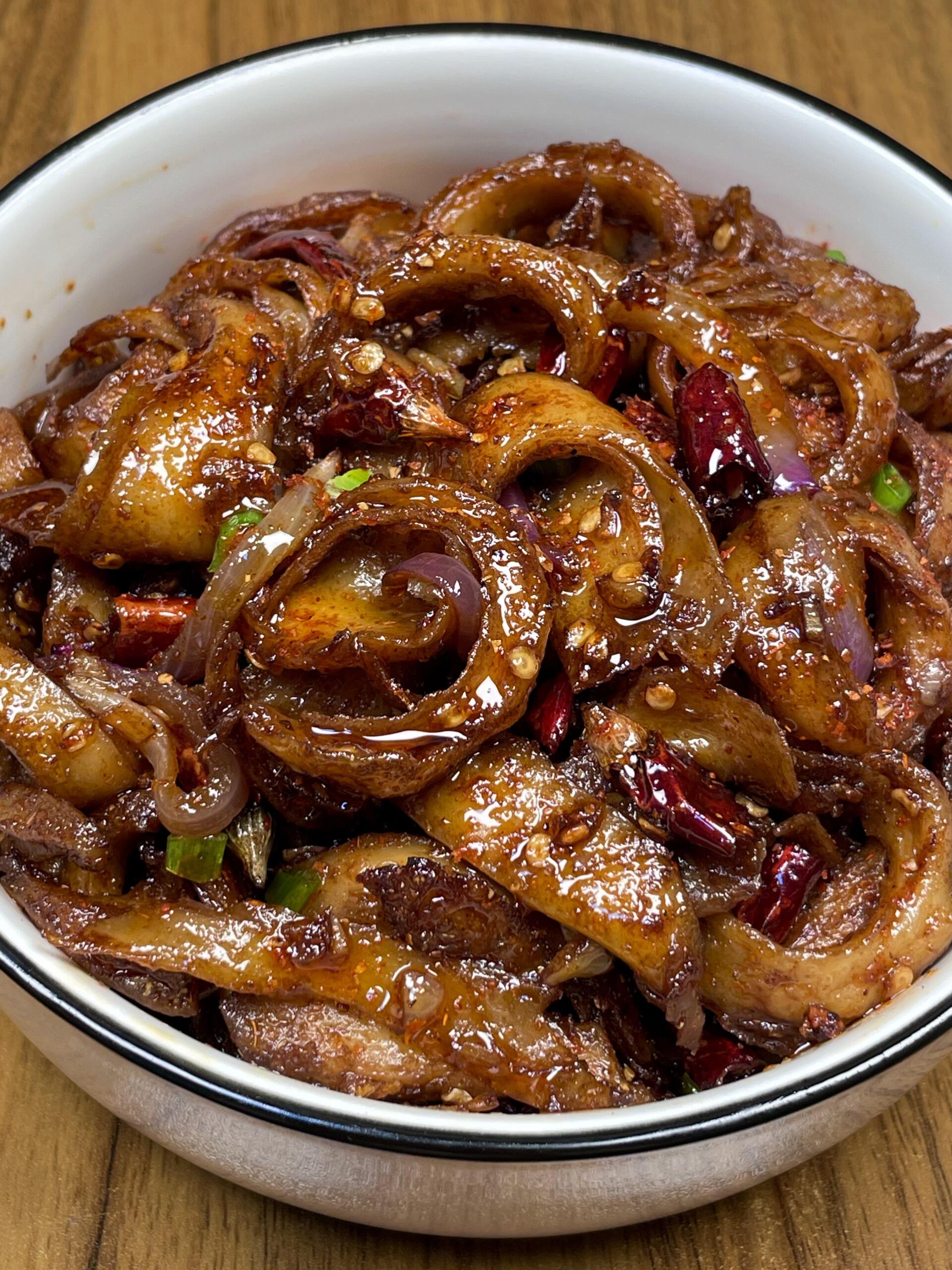香辣孜然炒面筋 食材 主料:面筋、洋葱 ​ 辅料:大蒜、干辣椒 ​ 调料:生抽、蚝油、老抽、十三香、盐、白糖、鸡精、孜然粉、辣椒粉、食用油   步骤 1. 爆香底料:热锅倒油烧热,油热后放入蒜末、干辣椒段、洋葱丝,中小火翻炒至洋葱变软、香味完全释放 ​ 2. 翻炒面筋:倒入切好的面筋条,转大火快速翻炒1-2分钟,让面筋充分吸收香味,表面微微焦香 ​ 3. 调味:加入半勺生抽、1勺蚝油、半勺老抽,翻炒均匀,给面筋上色提鲜,撒入少许十三香,继续翻炒均匀,让香料味融入面筋。根据口味加少许盐、半勺白糖、少许鸡精,再放入1勺孜然粉、1勺辣椒粉,大火快速翻炒 ​ 翻炒至所有调料均匀裹满面筋,即可关火装盘#炒面筋#