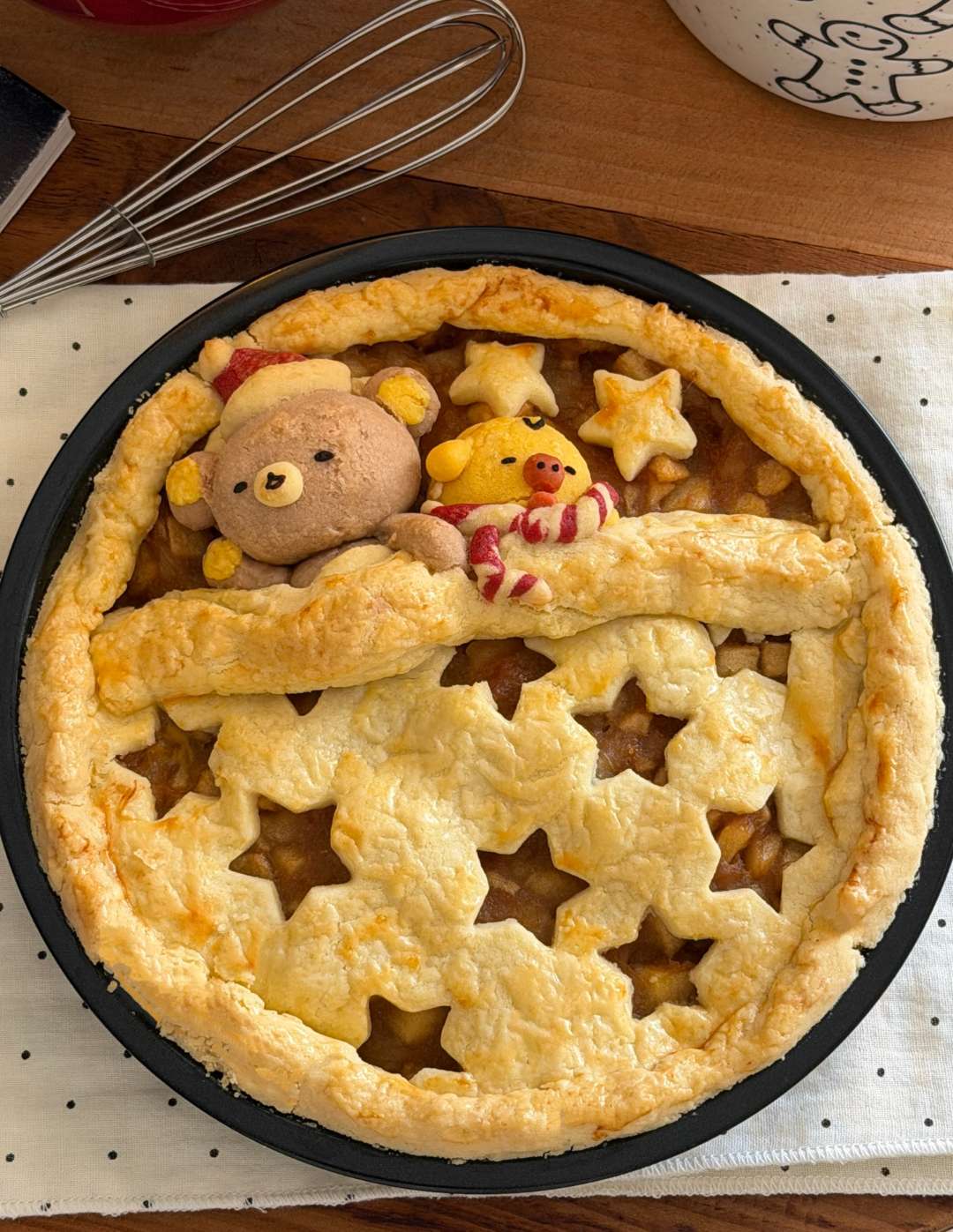 5️⃣取出面团,三分之一擀平放入模具中做派底,用小叉子扎小孔,加入苹果酱,取一小部分面团用可可粉,南瓜粉和红丝绒液调色,捏出轻松熊和鼻孔鸡,还有圣诞帽和围巾哦🧣~剩余面团擀平,用星星模具压出星星⭐形状,盖在派🥧上,星星小被子制作完成~