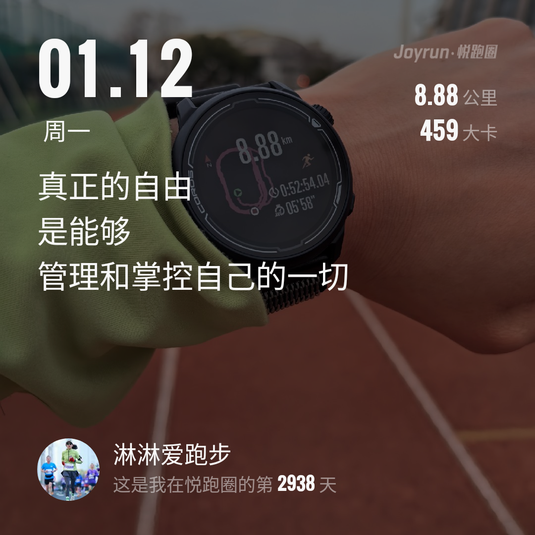 ❤2026.01.12. 跑步8.88公里。🏃 - 每一次奔跑, 都是一场与自己的长情对话。 - 听的不是音乐🎶, 而是身体的声音, 以及内心的声音。 - 过滤的是大脑垃圾, 清扫的是心地, 排出的是毒素, 呼出的是废气, 换来的, 是又一空杯的自己。 - 想要的不仅是多巴胺, 更是内啡肽。 #长期主义的人生 #自律带来自由 #向内求不是文字而已