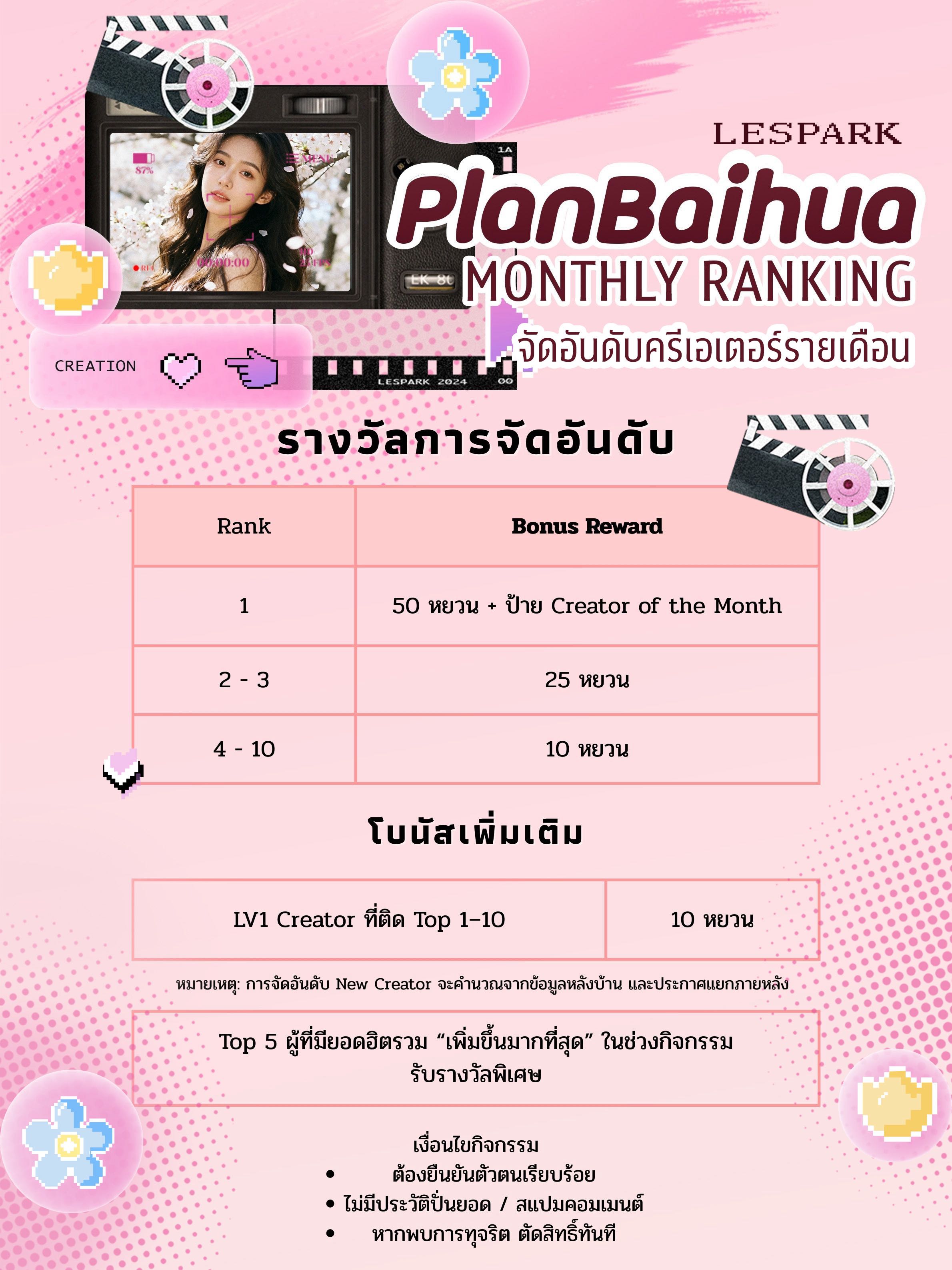 Baihua Ranking🌸 🌸 Baihua Monthly Ranking (New Update) 1️⃣ รางวัลอันดับหลัก (Top 1–10) * Top 1 – เงินรางวัล 50 หยวน + ป้าย Creator of the Month * Top 2–3 – เงินรางวัล 25 หยวน * Top 4–10 – เงินรางวัล 10 หยวน 2️⃣ โบนัสพิเศษสำหรับ LV1 Creator 🎉 🔹 LV1 Creator ที่ติด Top 1–10