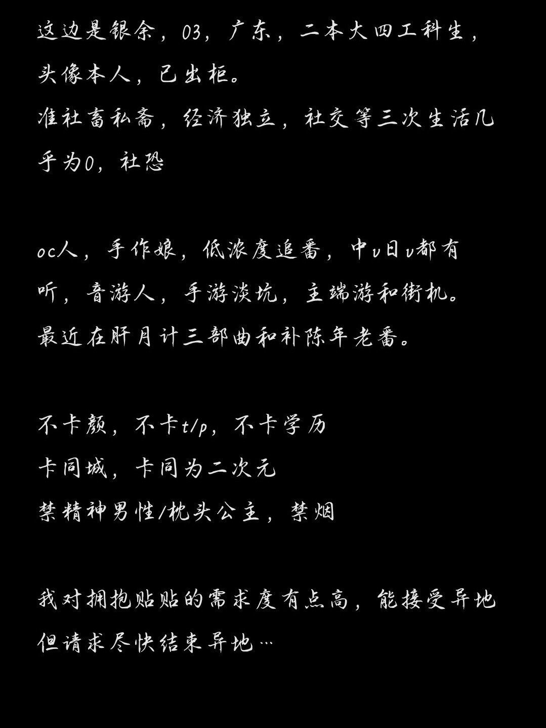 我从未主动交过朋友 “我从未主动交过朋友,我不擅长应对他人” “但确很在意他人的目光,我紧绷神经,尽力不让自己引人注目”