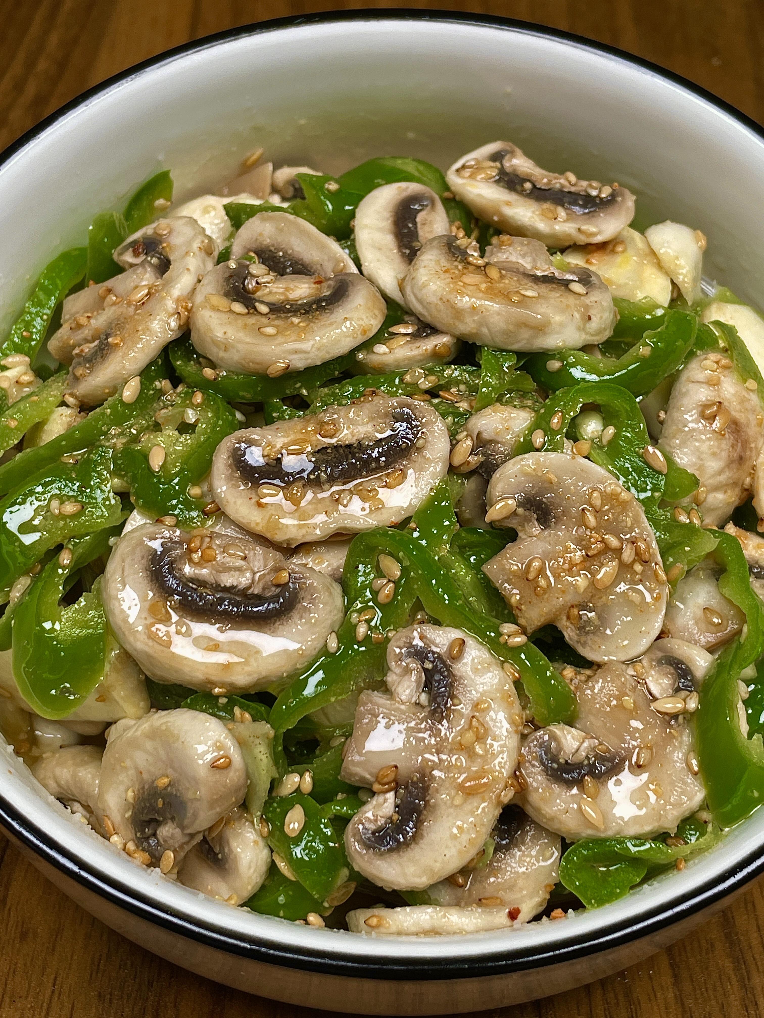低卡凉拌口蘑青椒 食材 口蘑(白蘑菇),青椒, 蒜瓣、白芝麻、香油、生抽、芝麻盐 步骤 1. 处理食材并焯水 口蘑洗净切片,水开后下锅焯水2分钟,捞出沥干;青椒切圈/切丝,水开后下锅焯水20秒,快速捞出沥干备用。 2. 准备调味 把焯好水的口蘑和青椒放入大碗中,加入拍扁的蒜瓣、白芝麻、少许香油、一点生抽和适量芝麻盐。 3. 拌匀开吃 用筷子充分搅拌均匀,让每一片食材都裹上料汁,静置几分钟更入味,直接就能吃啦!
