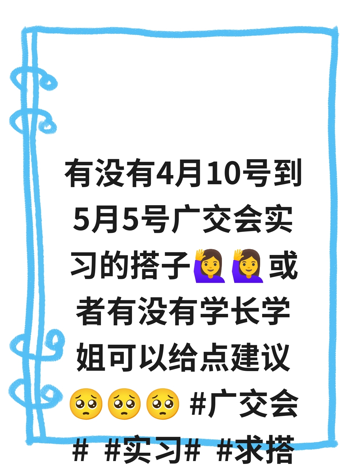 求广交会实习搭子 有没有4月10号到5月5号广交会实习的搭子🙋♀️🙋♀️或者有没有学长学姐可以给点建议🥺🥺🥺