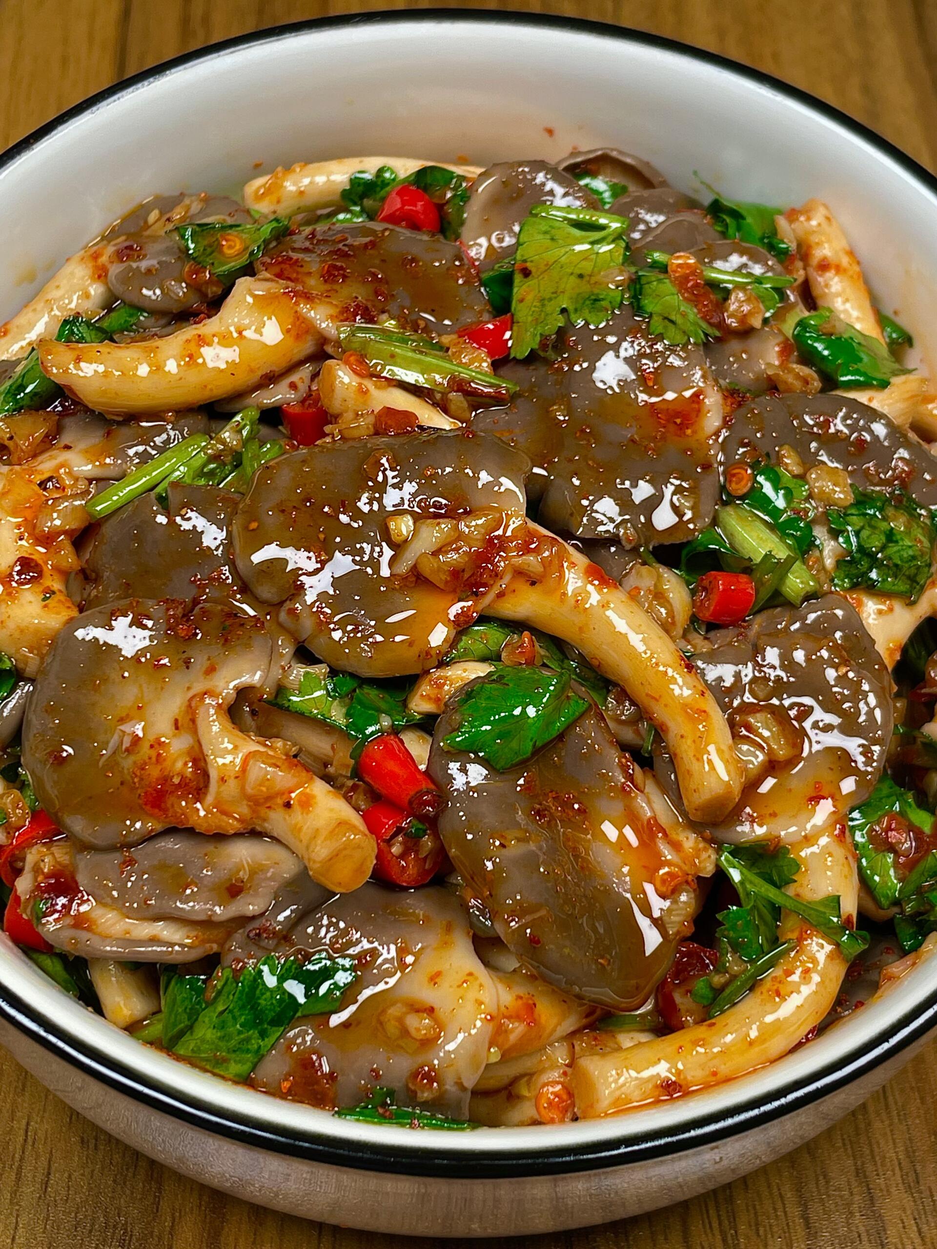 香辣爆炒平菇 食材 平菇 ,蒜末、小米辣,生抽 1勺、蚝油 1勺、辣椒面 ,香菜 ,食用油 步骤 1. 处理平菇 平菇洗净,撕成大小均匀的小朵;锅中水烧开,放入平菇焯水1分钟,捞出沥干水分备用。 2. 爆香底料 锅中倒油烧热,放入蒜末和小米辣,中小火炒出香味,注意别炒糊。 3. 调味翻炒 倒入沥干水分的平菇,加入1勺生抽、1勺蚝油和1勺辣椒面,快速翻炒均匀,让每一朵平菇都裹上料汁。 最后撒上香菜段,再快速翻拌几下,就可以出锅啦