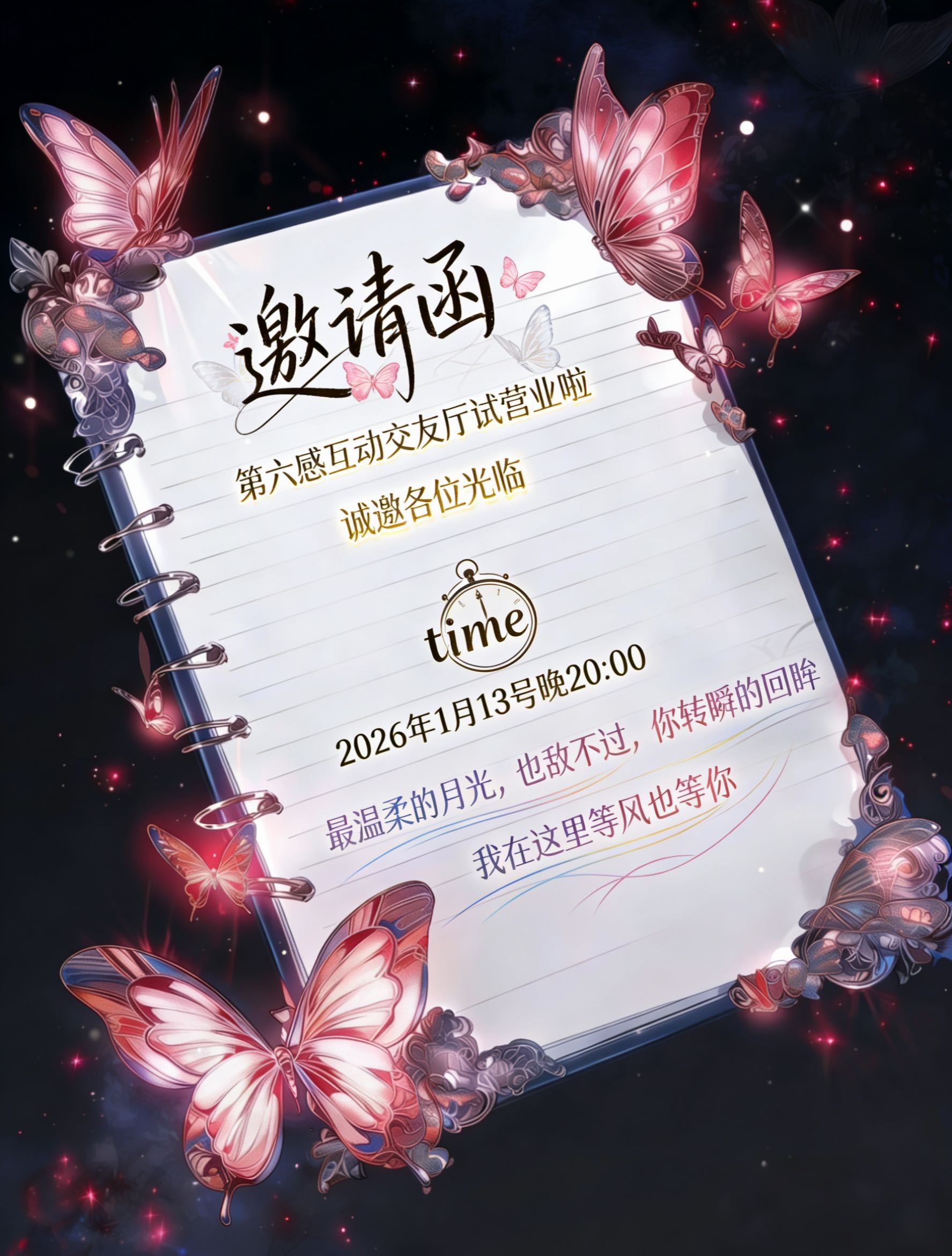 今天我们试营业啦~ @第六感℗互动交友/持续聘 试营业啦 诚邀各位光临光临~ 时间2026年1月13号晚20:00 最温柔的⽉光,也敌不过你转瞬的回眸 新厅开业持续招人 #新厅开业#