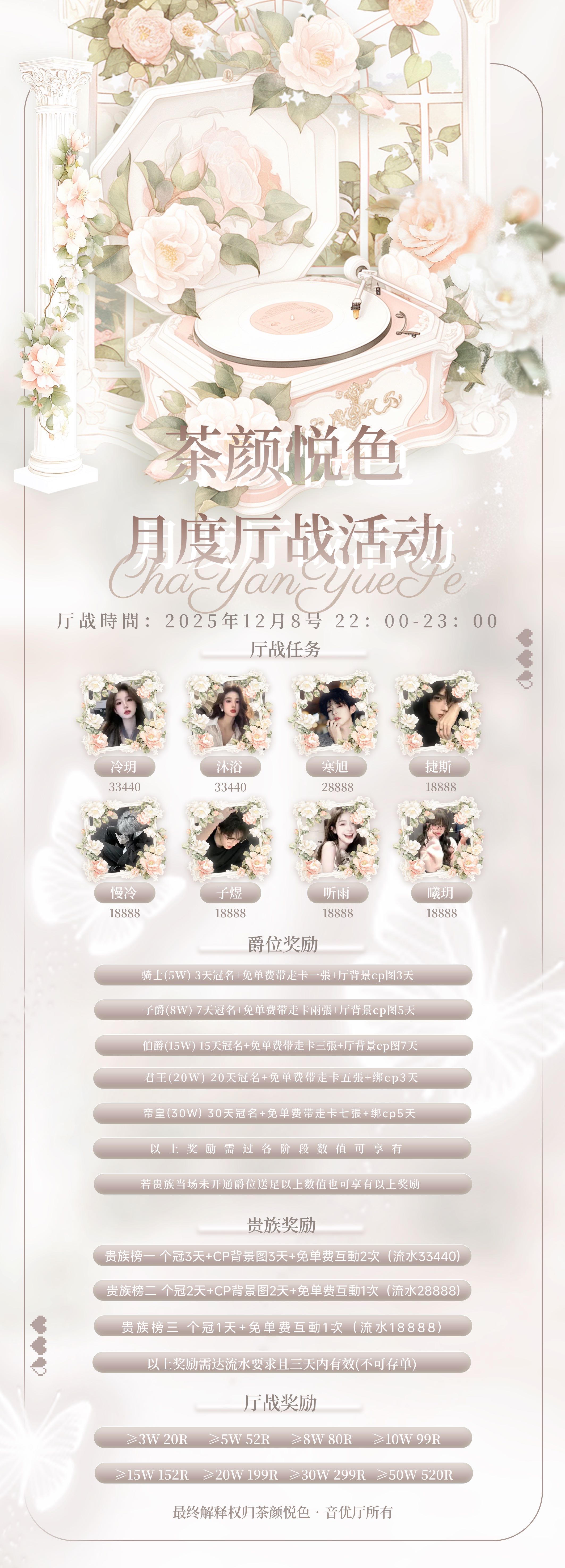 12/08 —— 你在 便是最好的世界 繁华四季不及你 满目柔情倾此生 🗓️ 日期:12/08 ⏰ 跨房PK时间:22:00 - 23:00 📜 任务 & 🎁 奖励清单:见下图 ⬇️ (最终解释权归茶颜悦色•音优厅所有)