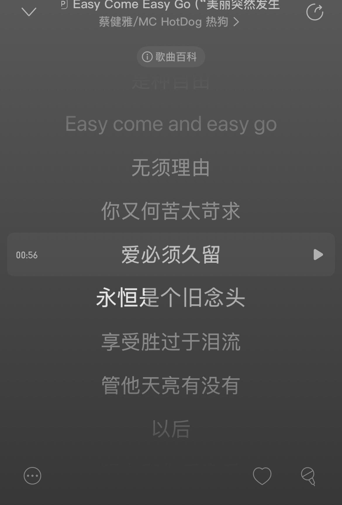 Easy come Easy go Easy come and Easy go 暧昧中又带点朦胧 为谁唱这歌在等候 它尽在不言中 她上了车她走后 再见不需要承诺 放轻松 不紧绷的关系 不需要卧底 或许 会牵手 或许只能在被窝里 或许 别管过去 只沉溺在此刻的漩涡里